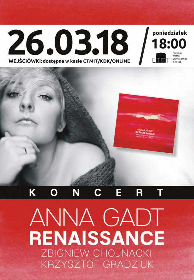 26 marca o godz. 18:00 zapraszamy do Centrum Teatru, Muzyki i tańca na koncert Anny Gadt w towarzystwie Zbigniewa Chojnackiego i Krzysztofa Gradziuka pt. "Renaissance". Koncert jest zaproszeniem do przemyśleń związanych z obchodami Świąt Wielkanocnych.