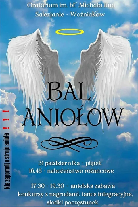 Bal Aniołów odbędzie się 31 października i rozpocznie się o godzinie 16:45 nabożeństwem różańcowym, po którym uczestnicy wezmą udział w anielskiej zabawie trwającej do 19:30. Organizatorzy zapowiadają konkursy z nagrodami, tańce integracyjne oraz słodki poczęstunek.
