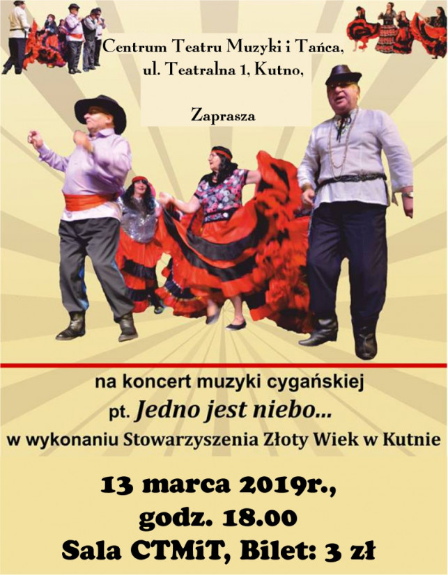 Stowarzyszenie Złoty Wiek z Kutna przygotowało program muzyczny opierający się na kulturze romskiej. 13 marca (środa) będziemy mogli wziąć udział w „Biesiadzie cygańskiej”, która odbędzie się w Centrum Teatru Muzyki i Tańca o godz. 18:00. Bilety w cenie 3 zł.
