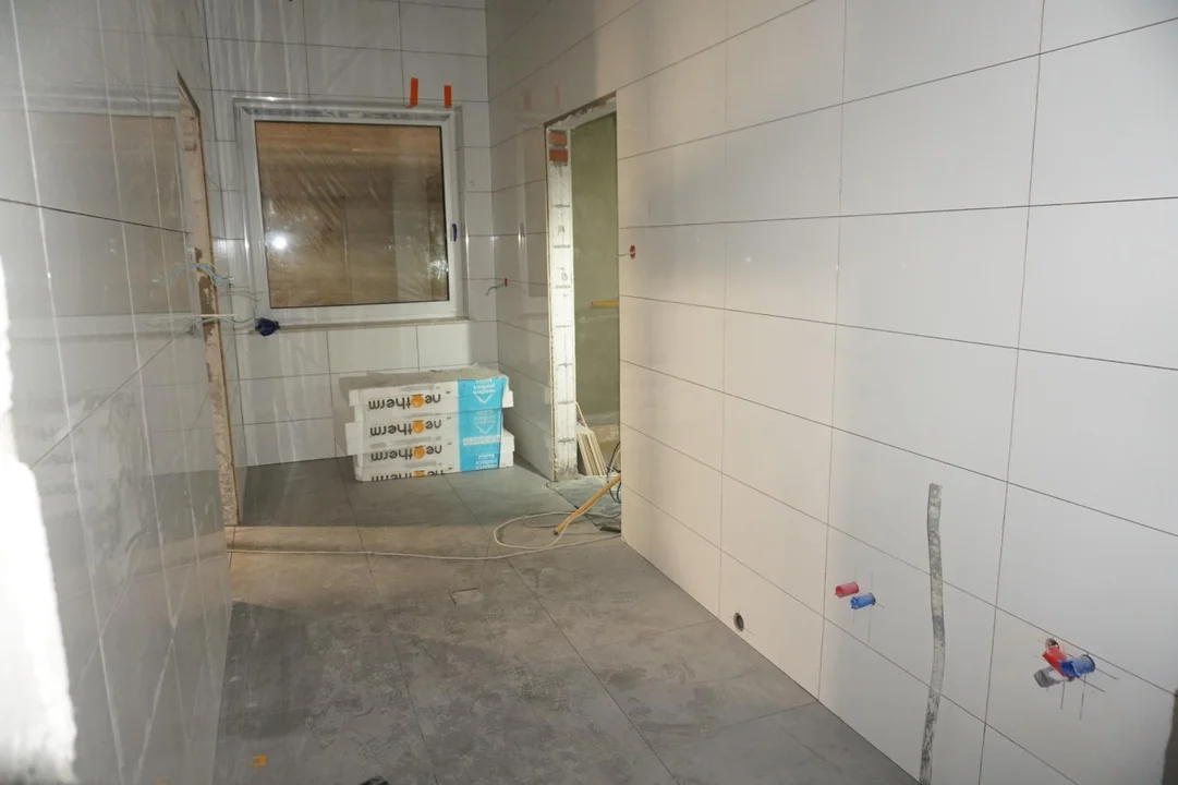 W ramach tych działań układane są płytki ścienne i podłogowe, a także prowadzone są prace przygotowawcze do montażu armatury oraz wyposażenia łazienek i pomieszczeń gospodarczych.