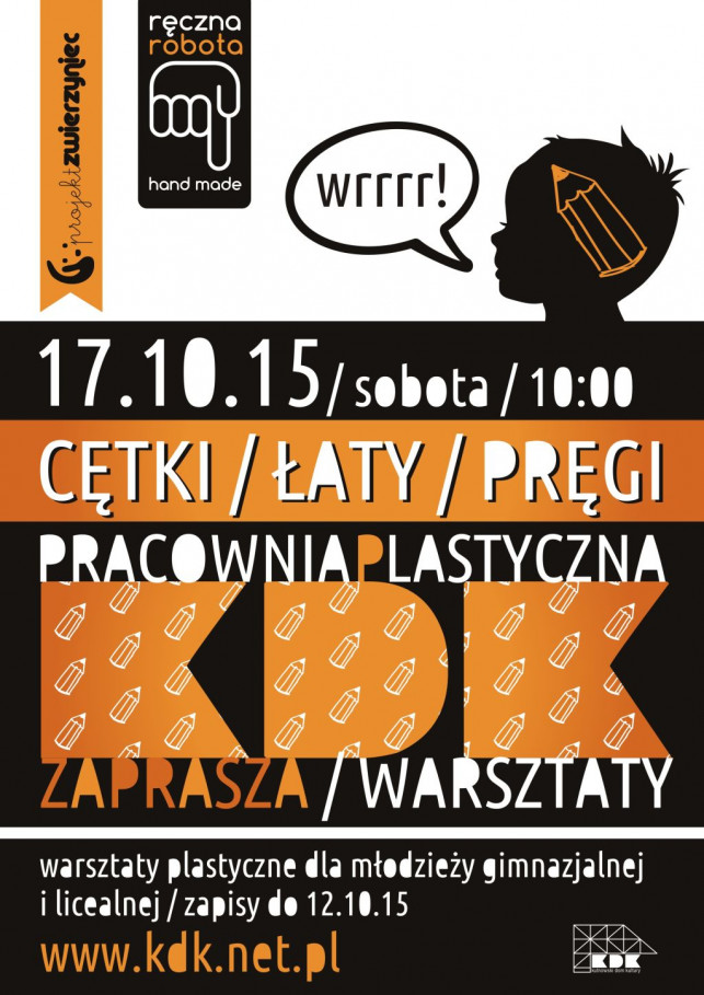 Kutnowski Dom Kultury zaprasza uczniów szkół gimnazjalnych i licealnych na warsztaty plastyczne realizowane w ramach Projektu Zwierzyniec. Warsztaty prowadzone przez instr. Agnieszkę Dąbrowska - Walczak, odbędą się 17 października w sali plastycznej KDK od godz. 10 do 15. Zapisy w sekretariacie KDK (tel. 24 254 21 37), zajęcia są bezpłatne.