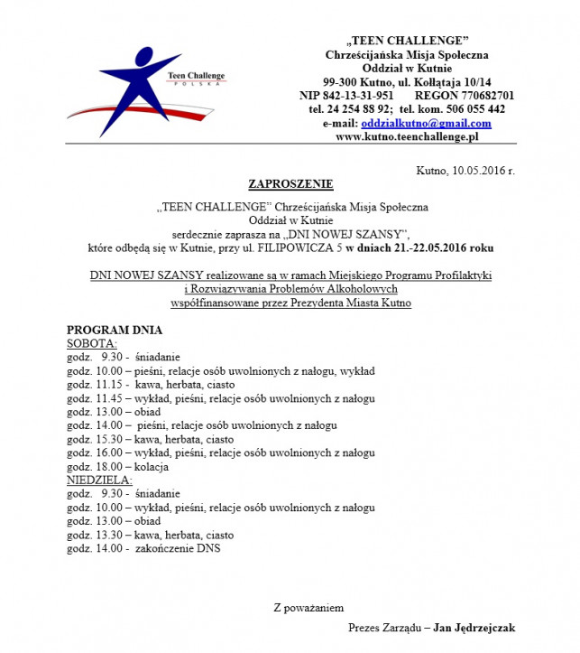 "Teen Challenge" Chrześcijańska Misja Społeczna Oddział w Kutnie serdecznie zaprasza na "Dni Nowej Szansy", które odbędą się w Kutnie, przy ul. Filipowicza 5 w dniach 21-22 maja.