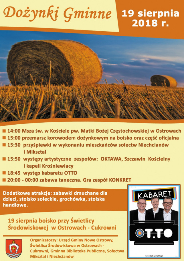 W tym roku Święto Plonów w gminie Nowe Ostrowy przypada na 19 sierpnia. Rozpocznie się tradycyjną mszą świętą, następnie barwny korowód przejdzie na boisko przy świetlicy środowiskowej w Ostrowach Cukrowni. Nie zabraknie występów artystycznych, atrakcji dla dzieci i zabaw tanecznych, a gwoździem programu będzie występ kabaretu pod Wyrwigroszem (w zastępstwie za kabaret OT.TO, który zrezygnował z występu).