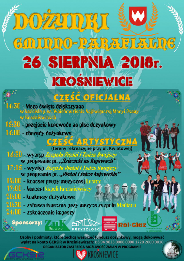 26 sierpnia na terenach rekreacyjnych przy ul. Kwiatowej w Krośniewicach odbędą się dożynki gminno-parafialne. Nie zabraknie atrakcji, tańców i koncertów.