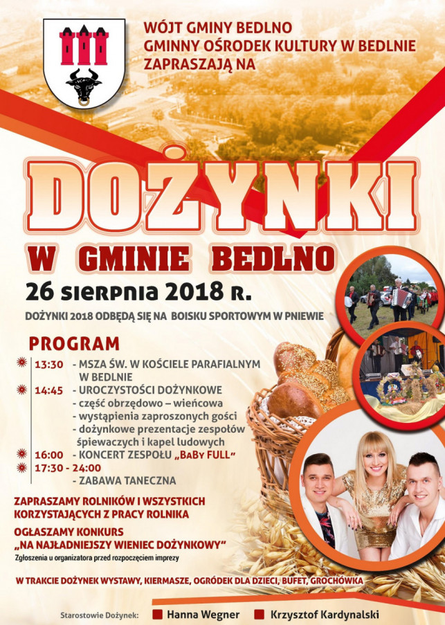 Wójt Gminy Bedlno i Gminny Ośrodek Kultury w Bedlnie zapraszają na dożynki, które odbędą się 26 sierpnia (niedziela) od godz. 13:30.