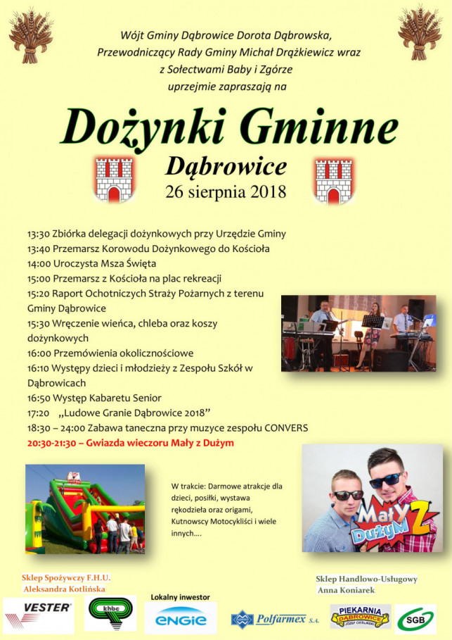 Wójt Gminy Bedlno, Przewodniczący Rady Gminy oraz Sołectwa Baby i Zgórze uprzejmie zapraszają na dożynki gminne, które odbędą się 26 sierpnia (niedziela) od godz. 13:30.