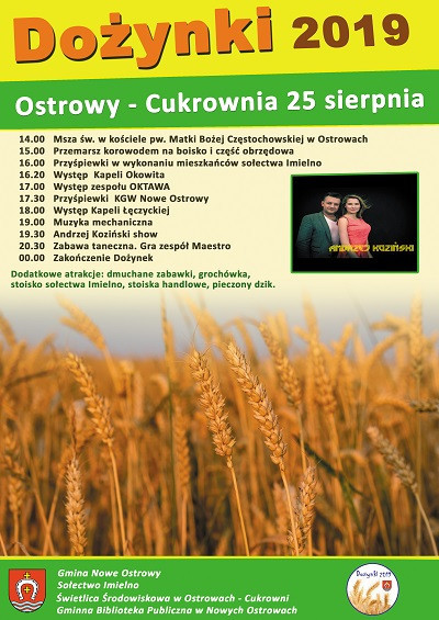 Gmina Nowe Ostrowy zaprasza na dożynki, które odbędą się 25 sierpnia na terenach przy Cukrowni. Rozpoczną się one mszą świętą o godz. 14:00 w kościele pw. Matki Bożej Częstochowskiej w Ostrowach. O 15 uczestnicy przemaszerują w korowodzie na boisko, gdzie będzie miała miejsce część obrzędowa. Od godz. 16 będą odbywać się występy zespołów i kapel ludowych i nie tylko. Całość zwieńczy zabawa taneczna, a ta startuje o 20:30.