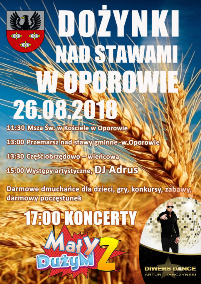 Władze gminy Oporów zapraszają na dożynki gminne, które odbędą się 26 sierpnia w niedzielę od godz. 11:30. Na gości czekać będzie mnóstwo atrakcji, m.in. dmuchańce dla dzieci, gry, konkursy, zabawy i darmowy poczęstunek. Na imprezie pojawią się także dwa zespoły muzyczne.