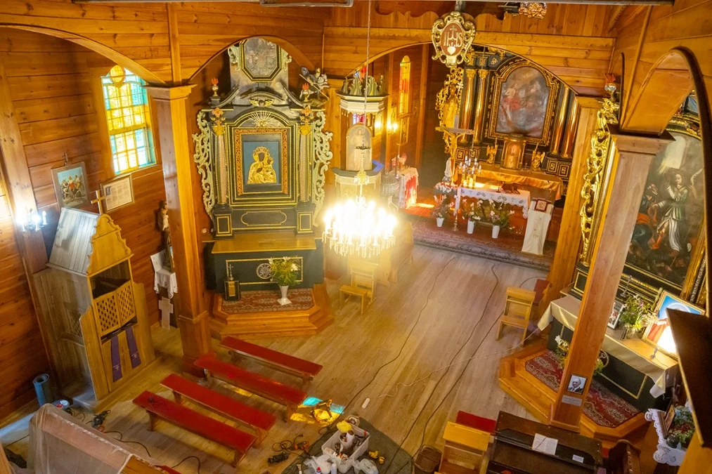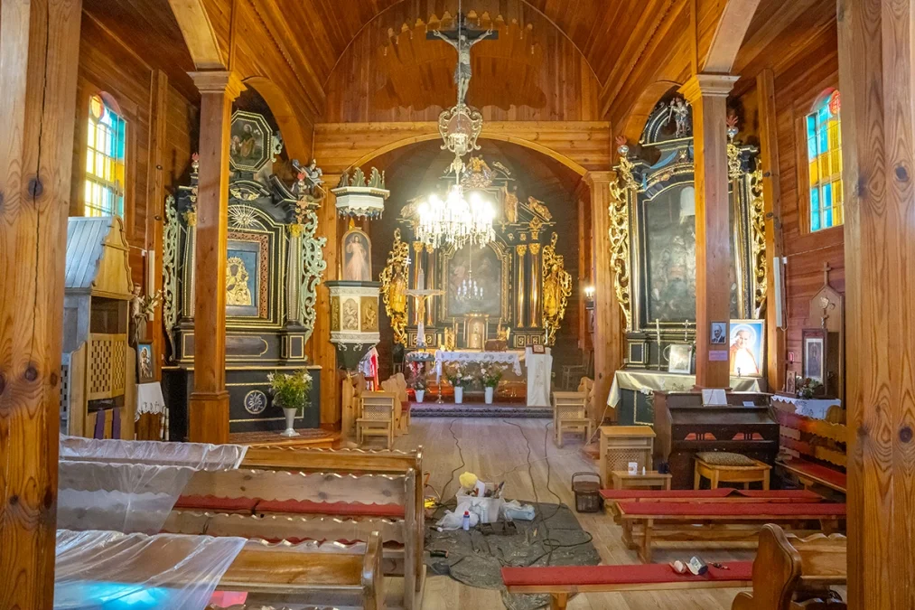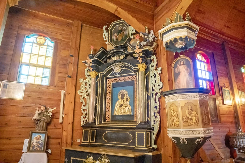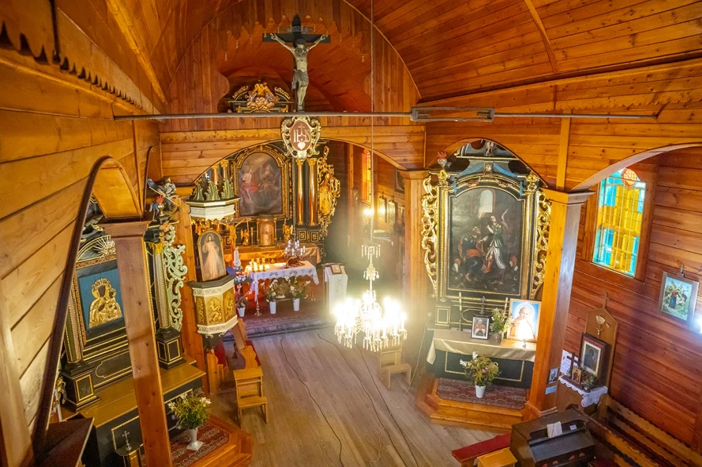 Wnętrze świątyni zachwyca prostotą i ciepłem naturalnego drewna. Nawa główna i prezbiterium mają sklepienie kolebkowe, a przestrzeń kościoła dzielą trzy nawy wsparte na masywnych słupach. W ołtarzu głównym oraz dwóch bocznych odnaleźć można wczesnobarokowe formy pochodzące z XVII wieku — prawdziwe perły dawnego rzemiosła snycerskiego. Ambona, choć wykonana w późniejszym okresie, zdobiona jest rokokowym baldachimem, który dodaje wnętrzu lekkości.