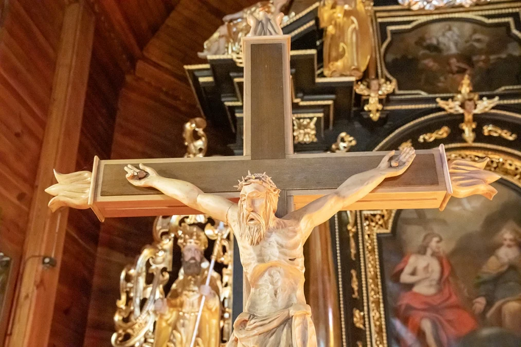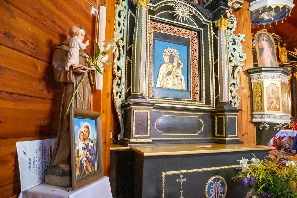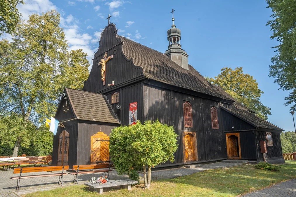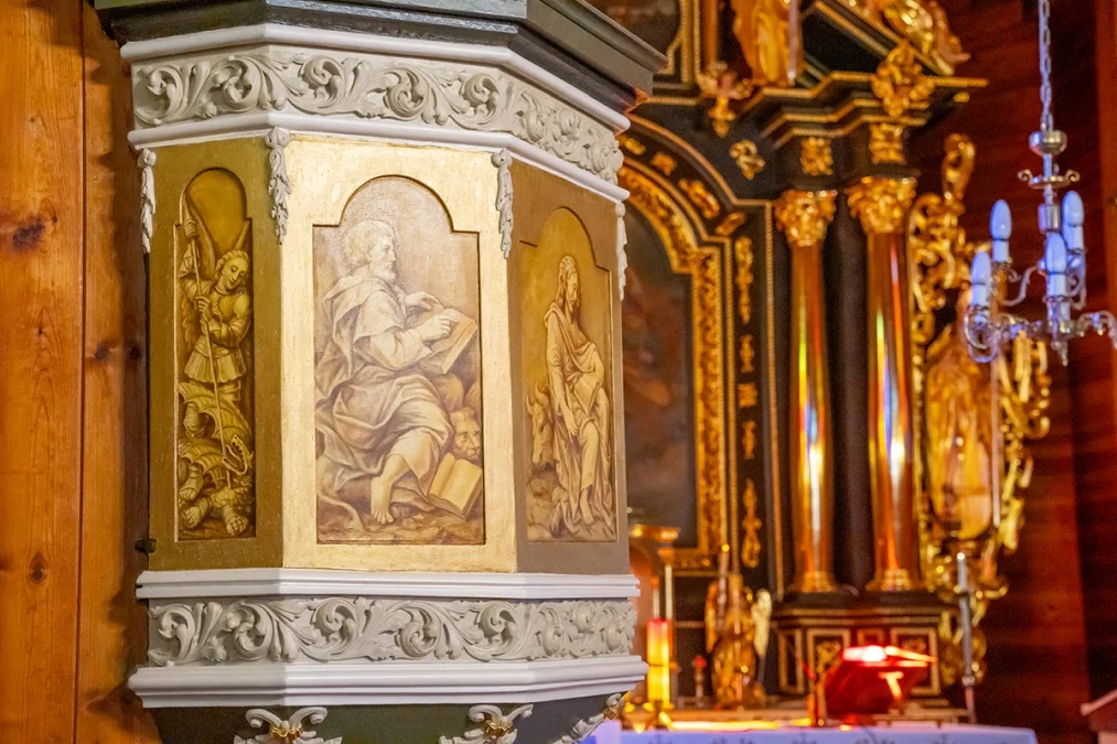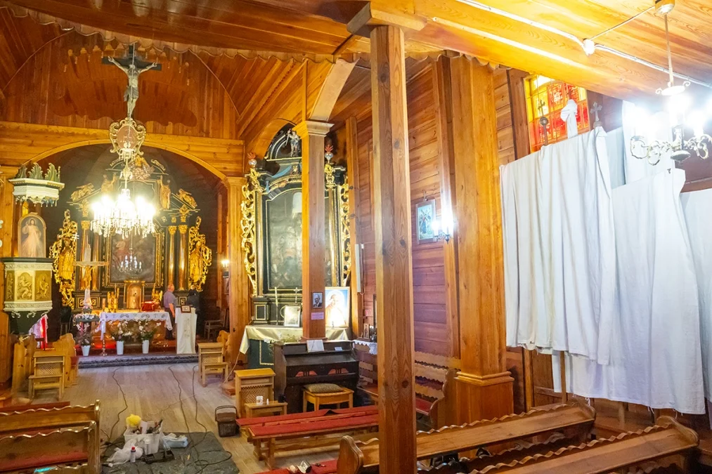 Wnętrze świątyni zachwyca prostotą i ciepłem naturalnego drewna. Nawa główna i prezbiterium mają sklepienie kolebkowe, a przestrzeń kościoła dzielą trzy nawy wsparte na masywnych słupach. W ołtarzu głównym oraz dwóch bocznych odnaleźć można wczesnobarokowe formy pochodzące z XVII wieku — prawdziwe perły dawnego rzemiosła snycerskiego. Ambona, choć wykonana w późniejszym okresie, zdobiona jest rokokowym baldachimem, który dodaje wnętrzu lekkości.