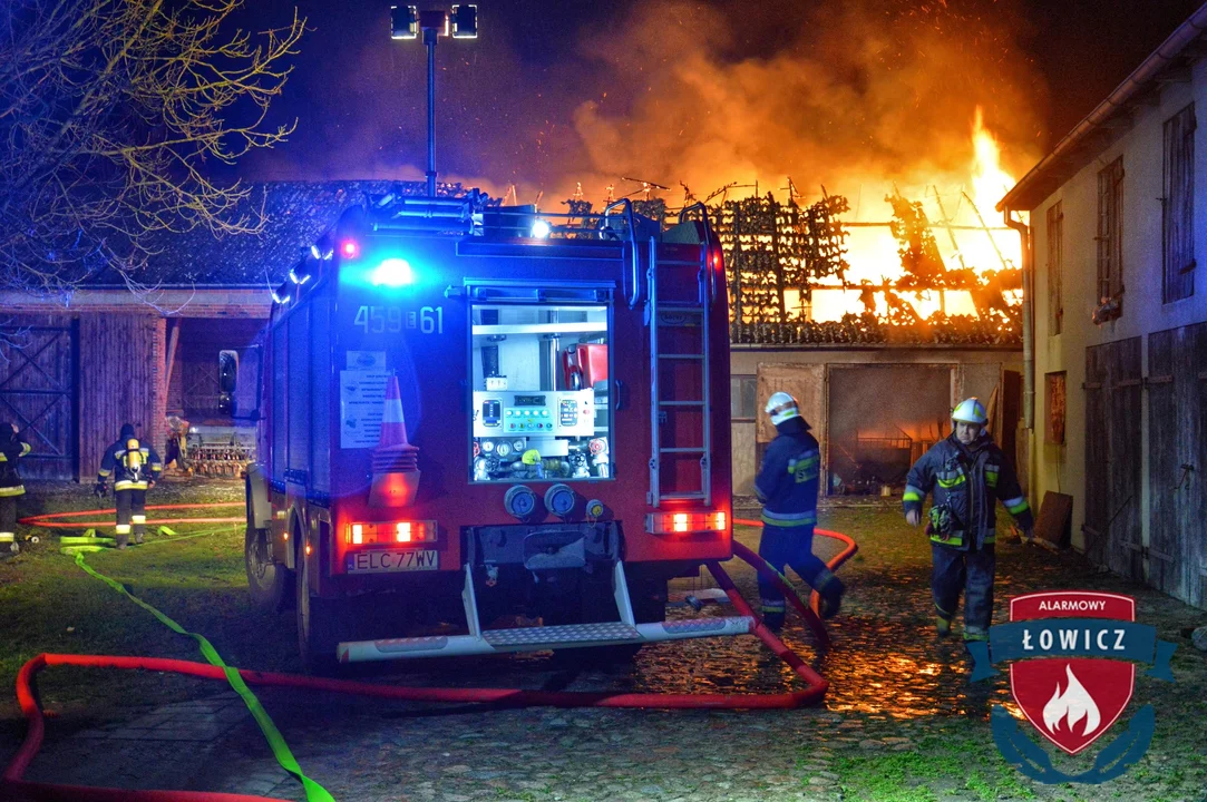 - Strażacy zastali na miejscu murowany budynek stodoły z przyległą oborą niemal całkowicie objęty ogniem. W momencie wybuchu pożaru część inwentarska była pusta, w środku nie znajdowały się żadne zwierzęta. We wnętrzu stodoły znajdowała się słoma i siano. Ogień szybko strawił drewnianą konstrukcję dachu krytą eternitem. Uszkodzeniu uległy również maszyny rolnicze - informuje Alarmowy Łowicz.