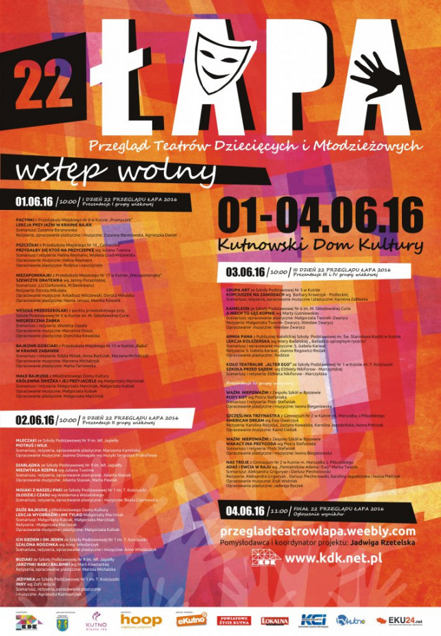 Tegoroczna ŁAPA potrwa 4 dni i odbędzie się w dniach 1-4 czerwca. Pierwszego dnia swój talent aktorski zaprezentują najmłodsi uczestnicy przeglądu, czyli przedszkolaki z kutnowskich przedszkoli, a także najmłodsza sekcja teatralna z Młodzieżowego Domu Kultury. Przed dwa kolejne dni na deskach KDK popis swojego aktorskiego kunsztu dadzą uczniowie szkół podstawowych oraz gimnazjalnych.