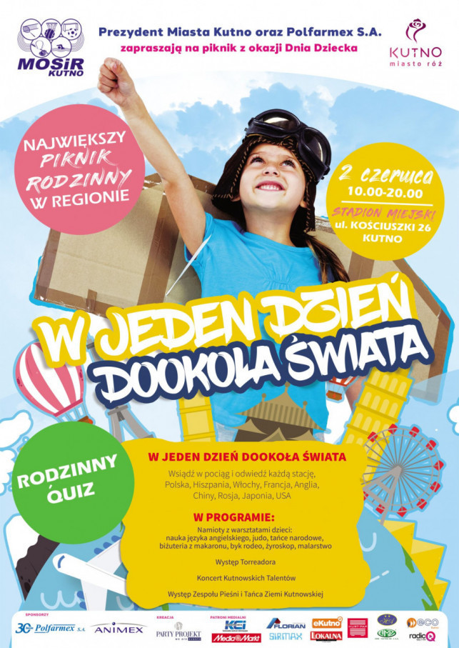 Prezydent Miasta Kutno i Polfarmex S.A serdecznie zapraszają 2 czerwca w godzinach od 10:00 do 20:00 na piknik z okazji Dnia Dziecka w Kutnie. „W jeden dzień dookoła świata” to tegoroczna edycja największego pikniku w regionie. Planowana od wielu miesięcy impreza będzie wyjątkowym wydarzeniem. Kolorowe atrakcje z różnych zakątków kuli ziemskiej przeniosą małych i dużych w fantastyczny świat podróży. Jak co roku organizatorzy zaplanowali także imponującą liczbę urządzeń rekreacyjnych, która zapewni płynne korzystanie z atrakcji.