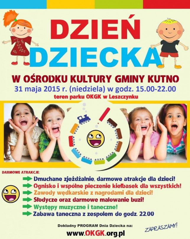 Serdecznie zapraszamy na Dzień Dziecka w Ośrodku Kultury Gminy Kutno. Już w najbliższą niedzielę czeka moc darmowych atrakcji dla wszystkich dzieci! Występy artystyczne, malowanie buzi, dmuchane domki i zjeżdżalnie, pieczenie kiełbasek przy ognisku, zabawa taneczna z zespołem muzycznym, turniej dart (rzutki), zawody wędkarskie dla najmłodszych, a także animacje z grupą Party Projekt. Nie może Was zabraknąć! Ruszamy w niedzielę, 31 maja 2015 roku o godzinie 15:00!
