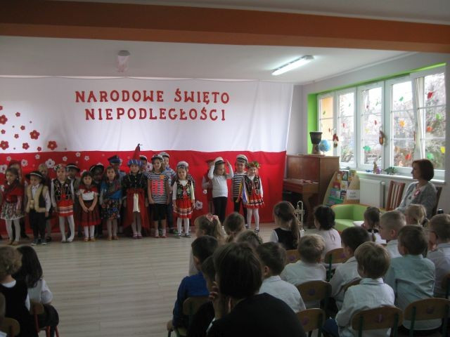 Na wstępie zgromadzeni rodzice i pracownicy przedszkola odśpiewali polski hymn państwowy. W doniosłej atmosferze i pięknej scenerii barw narodowych dzieci z grupy "Biedronki" zaprezentowały program artystyczny pod hasłem ,,Wycieczka po naszej Ojczyźnie". Na zakończenie uroczystości zebrani minutą ciszy uczcili pamięć poległych walczących za wolność naszego kraju.