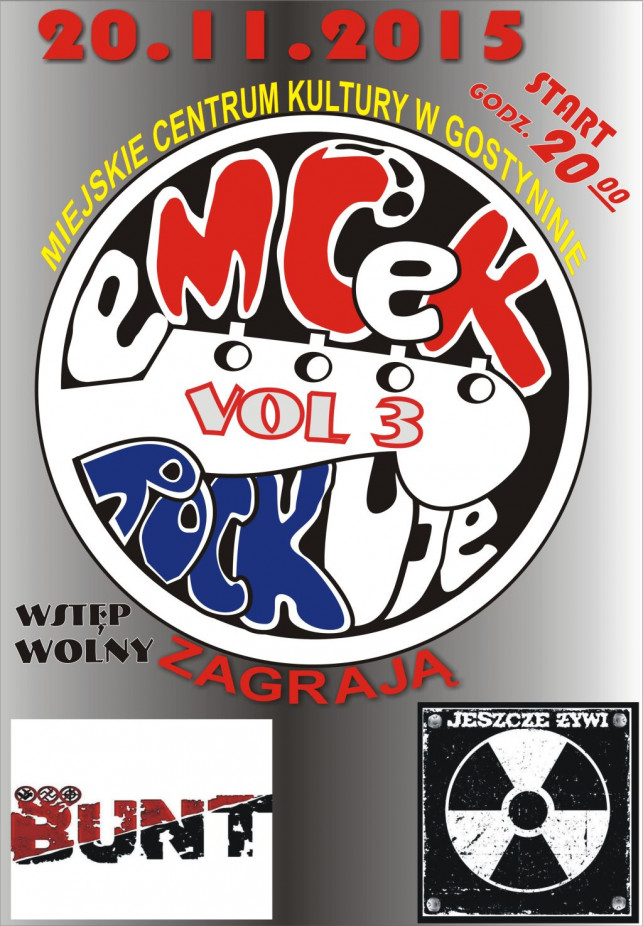 Ten koncert na pewno wybudzi Was z jesiennej ospałości! eMCeK vol. 3 już na horyzoncie, a wraz z nim "Jeszcze Żywi" (post-apocalitic punk z Gostynina) i "BUNT" (punk-rock z Garwolina).