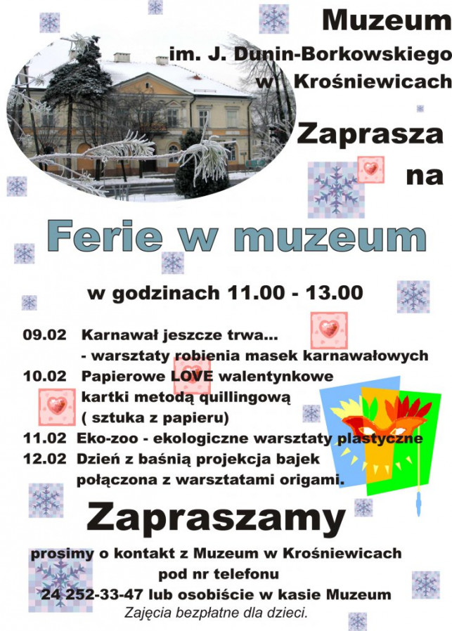 WydarzeniaMuzeum im. Jerzego Dunin-Borkowskiego w Krośniewicach zaprasza dzieci i młodzież szkolną powiatu kutnowskiego do wzięcia udziału w zajęciach w okresie ferii zimowych. W dniach 9-12 lutego placówka przygotowała dla Was mnóstwo atrakcji i twórczych warsztatów.Plan ferii:09.02 - Karnawał jeszcze trwa... - warsztaty robienia masek karnawałowych,10.02 - Papierowe LOVE - walentynkowe kartki metodą quillingową,11.02 - Eko-zoo - ekologiczne warsztaty plastyczne,12.02 - Dzień z baśnią - projekcja bajek połączona z warsztatami origami.