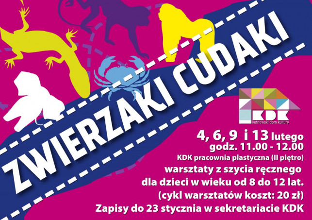 ZWIERZAKI CUDAKI - warsztaty z szycia ręcznego dla dzieci w wieku od 8 do 12 lat (cykl warsztatów koszt: 20 zł). Zapisy w sekretariacie KDK, tel. 24 254 21 37.