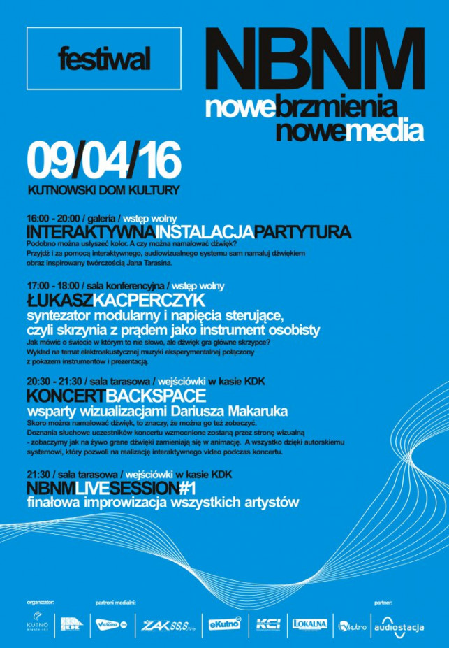 Już 9 kwietnia Kutnowski Dom Kultury zaprasza na pierwszą edycję festiwalu NBNM na którym m.in. interaktywna wystawa Dariusza Makaruka, wykład Łukasza Kacperczyka o syntezatorach modularnych oraz koncert zespołu BACKSPACE z interaktywnymi wizualizacjami. Wejściówki na festiwal dostępne w kasie KDK.