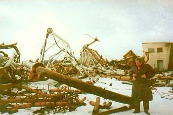 Na wzniesienie rekordowej konstrukcji potrzeba było pięciu lat, lecz jej upadek trwał zaledwie chwilę. Katastrofa wydarzyła się 8 sierpnia 1991 roku o godz. 19:10 podczas prac konserwatorskich związanych z wymianą zużytych odciągów. Jedna z lin pomocniczych wysunęła się z zacisków, druga zerwała się z mocowania, co doprowadziło do złamania górnej części masztu. Konstrukcja uderzyła w podstawę i zawaliła się w kilkanaście sekund.