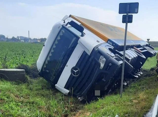 Wiele wskazuje na to, że kierowca ciężarowego mercedesa stracił panowanie nad pojazdem w wyniku trudnych warunków atmosferycznych.