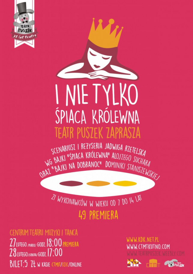 27 lutego, o godz. 18:00 w Centrum Teatru Muzyki i Tańca, Teatr Puszek przedstawi premierowo spektakl "I nie tylko śpiąca królewna". Spektakl wg scenariusza i reżyserii Jadwigi Rzetelskiej, na podstawie bajki Alojzego Suchara oraz "Bajki na dobranoc" Dominiki Staniszewskiej. W spektaklu wystąpi 21 wykonawców w wieku od 7 do 14 lat.