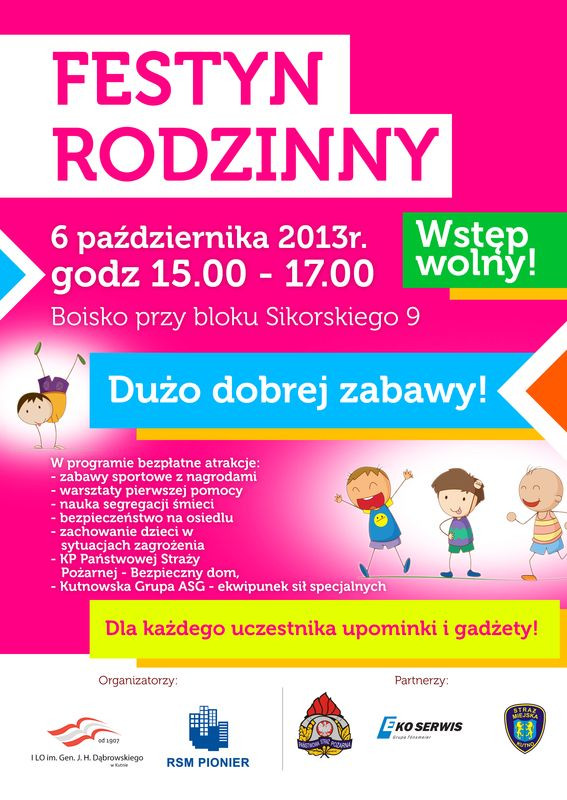 W najbliższą niedzielę, 6 października odbędzie się Festyn Rodzinny. Rozpocznie się on o godzinie 15:00 na boisku przy bloku Sikorskiego 9. Organizatorzy przewidzieli dwugodzinne atrakcje dla najmłodszych. Wstęp wolny.
