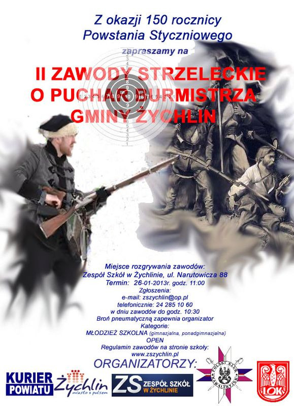 Z okazji 150 rocznicy Powstania Styczniowego odbędą się II zawody strzeleckie o puchar burmistrza Gminy Żychlin. Miejscem rozgrywania zawodów będzie Zespół Szkół w Żychlinie, ul. Narutowicza 88. Start rozgrywek przewidziano na 11:00, w sobotę 26 stycznia.