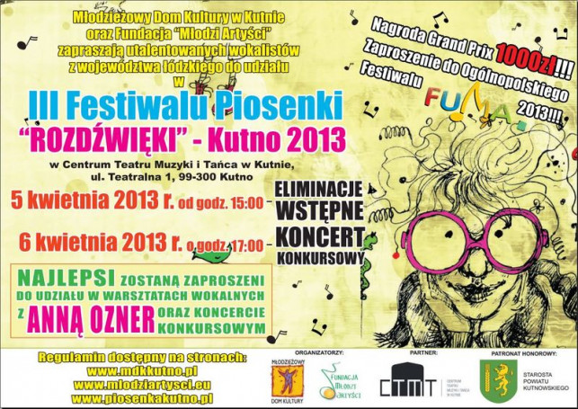WydarzeniaMłodzieżowy Dom Kultury w Kutnie oraz Europejska Fundacja Wspierania Talentów Dzieci i Młodzieży "Młodzi Artyści" zapraszają utalentowanych wokalistów z województwa łódzkiego do udziału w III Festiwalu Piosenki "Rozdźwięki" - Kutno 2013Eliminacje odbędą się w dniu 5 kwietnia w Centrum Teatru, Muzyki i Tańca. Przesłuchania od godziny 15:00. Koncert konkursowy odbędzie się dzień później. Start godzina 17:00. Warsztaty wokalne dla uczestników poprowadzi Anna Ozner.