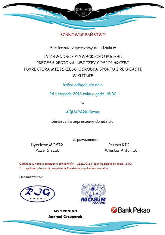WydarzeniaMOSiR Kutno zaprasza do udziału w IV Zawodach Pływackich o Puchar Prezesa RIG w Kutnie i Dyrektora Miejskiego Ośrodka Sportu i Rekreacji w Kutnie które odbędą się 24 listopada.Cel:1. Umożliwienie sprawdzenia swoich umiejętności pływackich w rywalizacji sportowej. 2. Propagowanie pływania jako formy rekreacji.3. Integracja samorządu terytorialnego z samorządem gospodarczym. Organizatorzy:1. Regionalna Izba Gospodarcza w Kutnie (RIG)2. PeKao S.A.3. Miejski Ośrodek Sportu i Rekreacji w Kutnie (MOSiR)4. AG Trening Andrzej Grzegorek