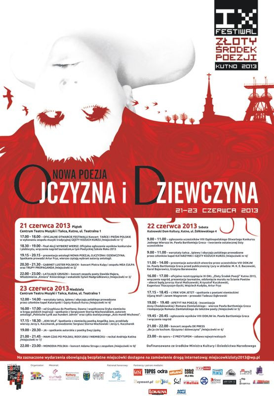 IX Festiwal „Złoty Środek Poezji” Kutno 2013 pod hasłem: "Nowa poezja, ojczyzna i dziewczyna" odbędzie się w dniach 21-23 czerwca. Wyśmienici goście, wspaniałe koncerty, niepowtarzalna atmosfera.
