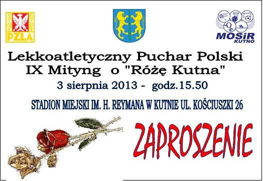 WydarzeniaW dniu 3 sierpnia br. odbędzie się się w ramach Lekkoatletycznego Pucharu Polski IX Mityng o Różę Kutna. Miejsce zawodów będzie stadion MOSiR przy ul. Kościuszki 26. Organizator Prezydent Miasta Kutno PZLA oraz MOSiR Kutno. W mityngu wystartuje ponad 150 zawodniczek i zawodników z całej Polski