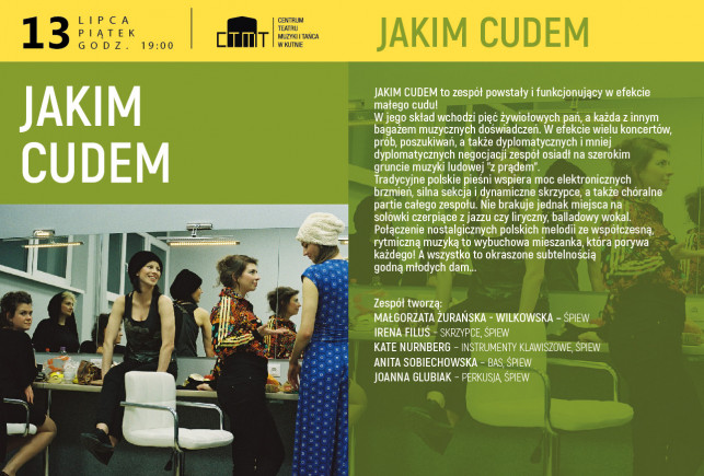 "Jakim Cudem" to zespół powstały i funkcjonujący w efekcie małego cudu! W jego skład wchodzi pięć żywiołowych pań, a każda z innym bagażem muzycznych doświadczeń. W efekcie wielu koncertów prób, poszukiwań, a także dyplomatycznych i mniej dyplomatycznych negocjacji zespół osiadł na szerokim gruncie muzyki ludowej "z prądem". Tradycyjne polskie pieśni wspiera moc elektronicznych brzmień, silna sekcja i dynamiczne skrzypce, a także chóralne partie całego zespołu. Nie brakuje jednak miejsca na solówki czerpiące z jazzu czy liryczny, balladowy wokal. Połączenie nostalgicznych polskich melodii ze współczesną, rytmiczną muzyką to wybuchowa mieszanka, która porywa każdego! A wszystko to okraszone subtelnością godną młodych dam...