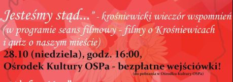 GCKSiR w Krośniewicach zaprasza Mieszkańców i Gości na program pt. ,,Jesteśmy stąd…”. Spotkanie zaplanowano jako seans filmowy z wykorzystaniem materiałów dotyczących Krośniewic – projekcja odbędzie się 28 października (niedziela) o godz. 16.00 w sali widowiskowej Ośrodka Kultury OSPa. Zaprezentowane zostaną filmy pozyskane od TVP Łódź – krótkie relacje reporterskie, kilkuminutowe reportaże, ale też nagrania przygotowane na zlecenie miejscowych firm i instytucji (np. z jubileuszu Spółdzielni Mieszkaniowej ,,Przyszłość”), a także obrazy nagrane przez mieszkańców. Powstały w ostatnich 2-3 dekadach.