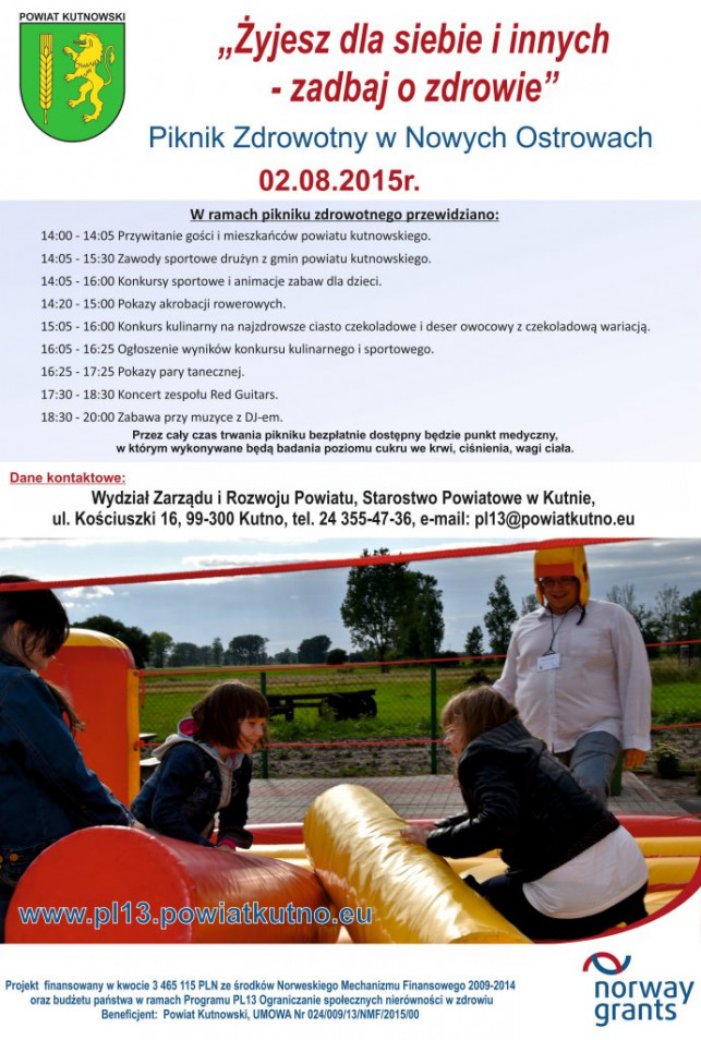 WydarzeniaStarosta kutnowski Krzysztof Debich zaprasza wszystkich mieszkańców Powiatu Kutnowskiego na Piknik Zdrowotny, który odbędzie się w dniu 2 sierpnia 2015 roku w Nowych Ostrowach.Przez cały czas trwania pikniku bezpłatnie dostępne będą: punkt medyczny, w którym będzie możliwość zrobienia badań poziomu cukru we krwi, ciśnienia i wagi ciała.Na imprezie będzie mozna wypełnić ankiety - wywiady medyczne.