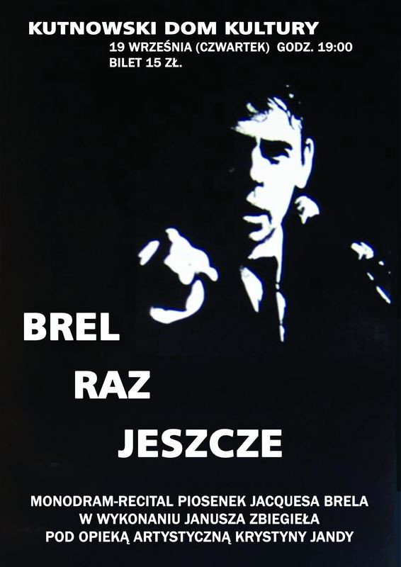 WydarzeniaW czwartek, 19 września na scenie Kutnowskiego Domu Kultury zaprezentuje się Janusz Zbiegieł. Koncert pt. "Brel raz jeszcze" to propozycja sceniczna krakowskiego aktora i paryskiego stypendysty "Conservatoire Mobel'l Alice Don" nie jest ani recitalem, ani estradą piosenki.Jest mięsistym teatrem, którego siła to organiczne zespolenie śpiewanej po francusku piosenki i komentującego każdy z 11 przebojów Brela ("Matylda", "Następny", "Piosenka Jacky'ego", "Burżuje", "Moje dzieciństwo", Starzy kochankowie", "Nie opuszczaj mnie", "Staruszkowie", "Przyjdę", "Amsterdam" i "Poszukiwanie" tekstu-wyznania, fragmentu listu do żony.