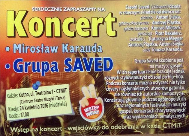 Kościół Adwentystów Dnia Siódmego Zbór Kutno zaprasza mieszkańców Kutna i okolic na koncert wokalisty Mirosława Karaudy i grupy SAVED.