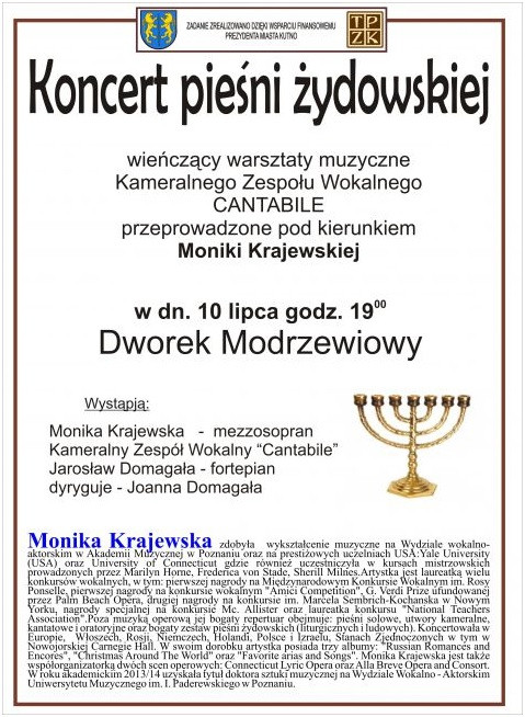 10 lipca na godz. 19 w Dworku Modrzewiowego odbędzie się wyjątkowy koncert pieśni żydowskiej w wykonaniu Kameralnego Zespołu Wokalnego Cantabile przy TPZK pod dyrekcją Joanny Domagały, gościnnie wystąpi Monika Krajewska - mezzosopran - znakomita polska śpiewaczka, mieszkająca na stałe w Nowym Yorku. Akompaniować będzie Jarosław Domagała.