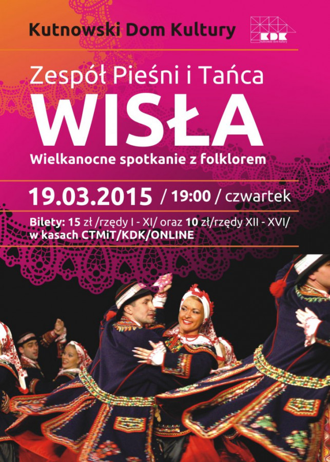 Kutnowski Dom Kultury zaprasza 19 marca o godz. 19:00 na występ Zespołu Pieśni i Tańca "WISŁA" z Płocka. Tym razem koncert to okazja do wielkanocnego spotkania z folklorem.
