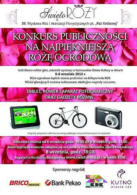 1. Konkurs publiczności na „Najpiękniejszą Różę Ogrodową Święta Róży Kutno 2013 r.” ma na celu wyłonienie spośród prezentowanych na wystawie róż ogrodowych jednej odmiany, która najbardziej spodobała się odwiedzającym tegoroczną wystawę róż ogrodowych.