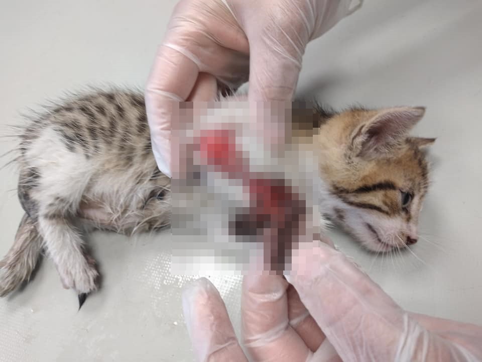 Kot odniósł poważne obrażenia. Ma oddartą skórę z prawej, przedniej łapy, a także obcięte palce.