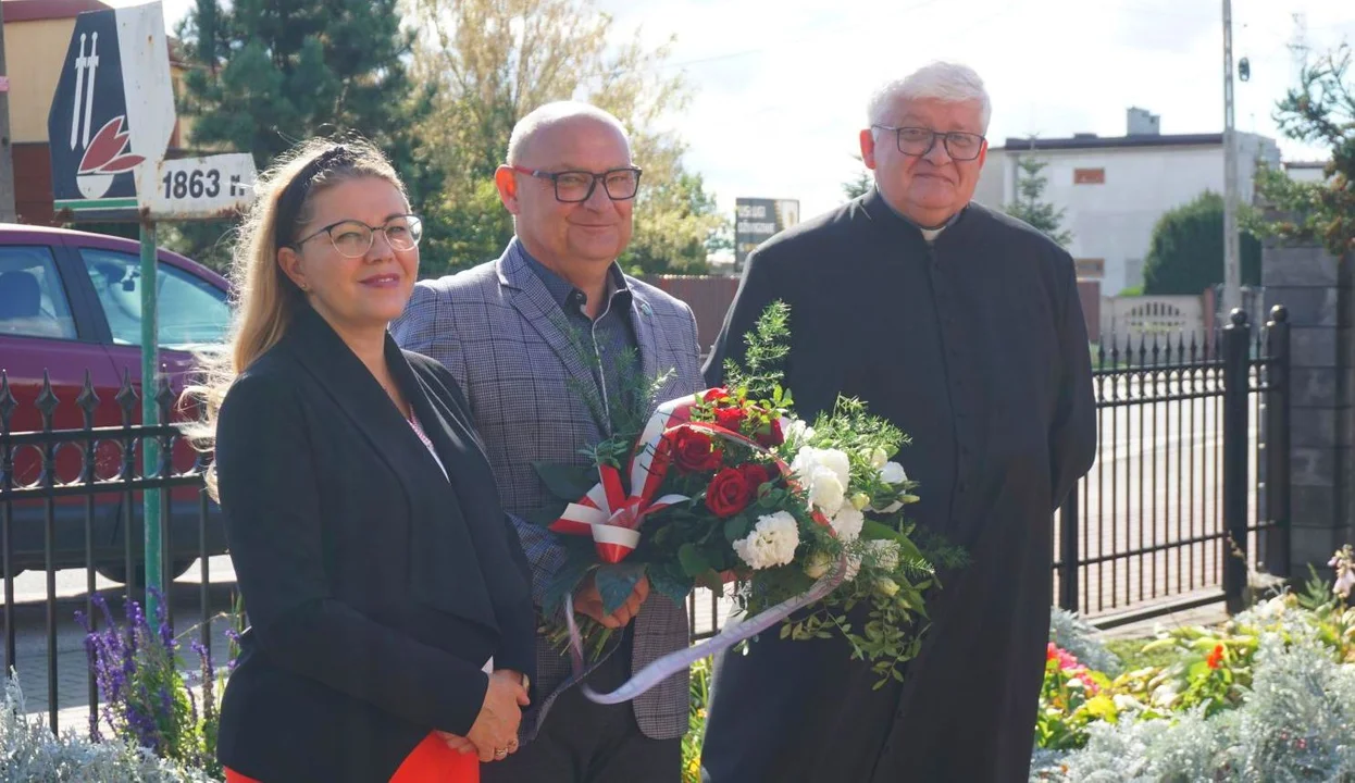 Przewodniczący Rady Miasta Kutno - Paweł Markiewicz oraz Dorota Bień - inspektor Wydziału Kultury Promocji i Rozwoju Miasta złożyli kwiaty pod tablicą poświęconą Polskiemu Państwu Podziemnego.