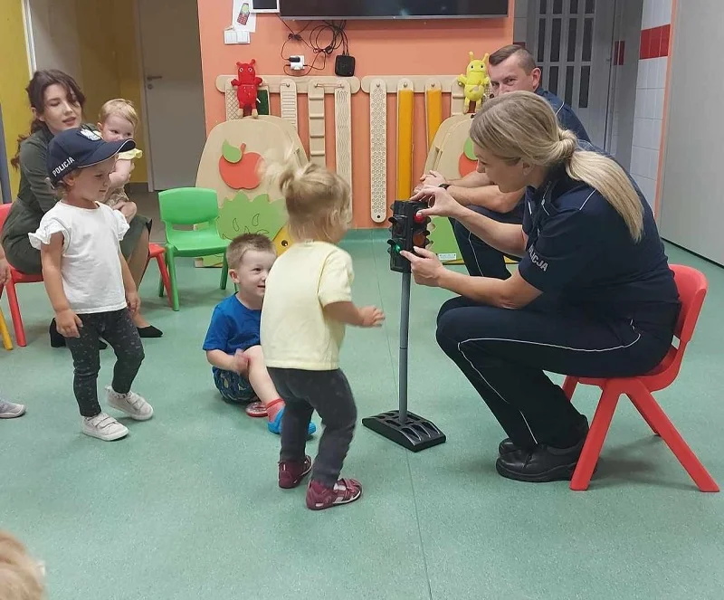 Dzieci chętnie słuchały i bawiły się sygnalizatorem przyniesionym przez funkcjonariuszy. Maluszki dowiedziały się, gdzie można bezpiecznie przejść na drugą stronę ulicy oraz jak należy się poruszać, gdy nie ma chodnika.