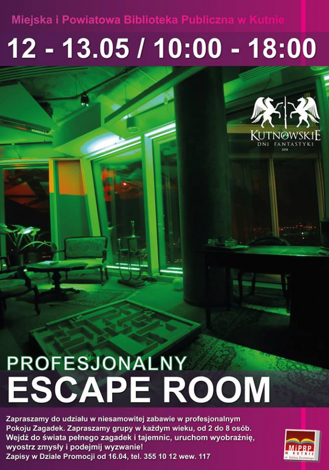 Będzie to pierwszy profesjonalny i bezpłatny pokój zagadek w Kutnie. Wszyscy gotowi na nowy wymiar rozrywki Escape Game mogą od 16 kwietnia dokonywać zapisów w Dziale Promocji biblioteki lub pod nr telefonu: 24 355 10 12 wew. 117. Zapisy dla grup w każdym wieku, jedna grupa: 2-8 osób. Escape Room dostępny będzie tylko 12-13 maja podczas Kutnowskich Dni Fantastyki.