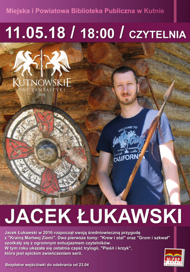 W piątek (11 maja) w czytelni kutnowskiej biblioteki miejskiej odbędzie się kolejne spotkanie autorskie, tym razem jego ściem będzie Jacek Łukawski - pochodzący z Kielc grafik komputerowy, który w 2016 rozpoczął swoją średniowieczną przygodę z "Krainą Martwej Ziemi", wzbudzającą w czytelnikach ogromny entuzjazm. "Krew i stal" dał mu zapał do napisania drugiego tomu, "Gromu i szkwału". W tym roku ukazała się ostatnia część trylogii, "Pieśń i krzyk", która jest epickim zwieńczeniem serii. Na rozmowę poprowadzoną przez Marię Szymczak zapraszamy o godz. 18:00.
