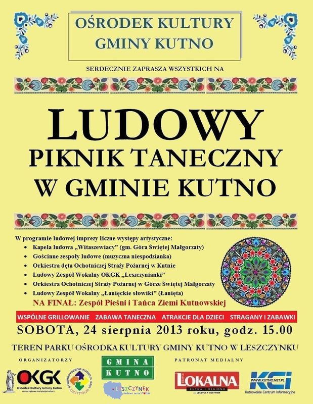 Ośrodek Kultury Gminy Kutno serdecznie zaprasza na Ludowy Piknik Taneczny, który w tym roku odbędzie się w sobotę, 24 sierpnia (start o godz. 15:00). Zapewniamy znakomitą atmosferę, wiele atrakcji, dobrą zabawę, a przede wszystkim porcję dobrej muzyki w tradycyjnym wydaniu. Spędź sobotnie popołudnie z nami!