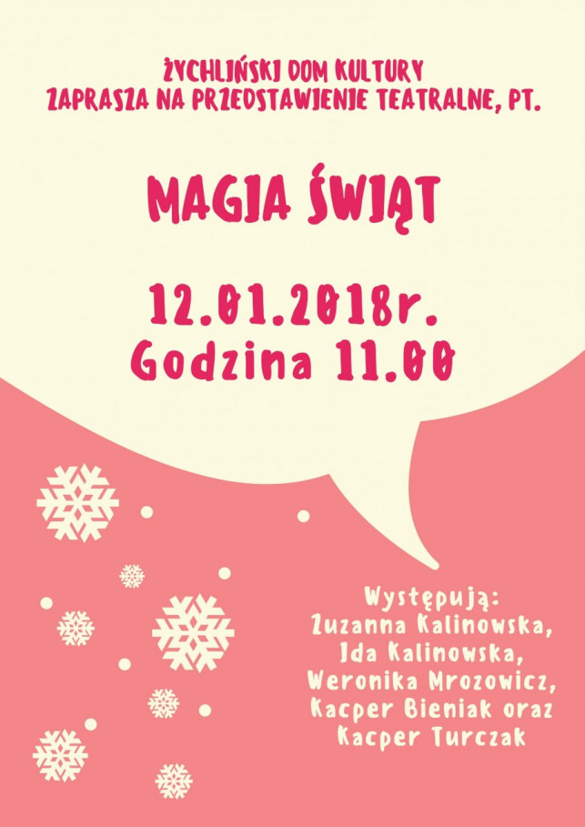 Piątka zdolnych nastolatków, należąca do Grupy Teatralnej w Żychlińskim Domu Kultury, przygotowała wyjątkowo przejmujące przedstawienie pt. „Magia świąt”. Zobaczyć je będzie można już 12 stycznia o godz. 11.00 w ŻDK.