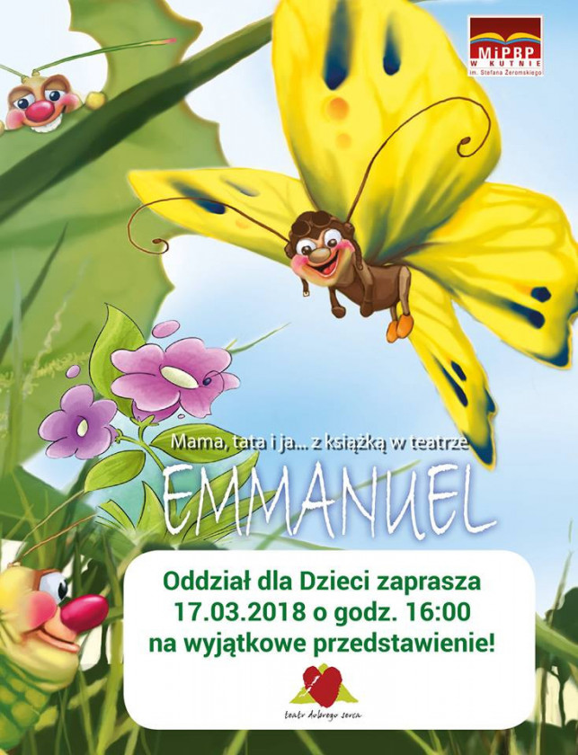 17 marca o godz. 16.00 Oddział dla Dzieci Miejskiej i Powiatowej Biblioteki Publicznej w Kutnie zaprasza na przedstawienie pt. ,,Emmanuel” w wykonaniu teatru Dobrego serca z Warszawy.