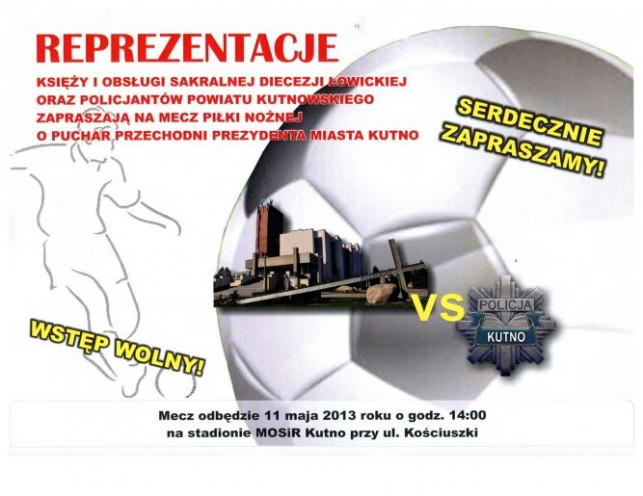 W sobotę, 11 maja na stadionie miejskim w Kutnie dojdzie do niezwykle ciekawej konfrontacji. O godzinie 14:00, reprezentacje Księży i Obsługi Sakralnej Diecezji Łowickiej i Policjanci Powiatu Kutnowskiego rozegrają na stadionie miejskim mecz piłki nożnej o Puchar Przechodni Prezydenta Miasta Kutno.