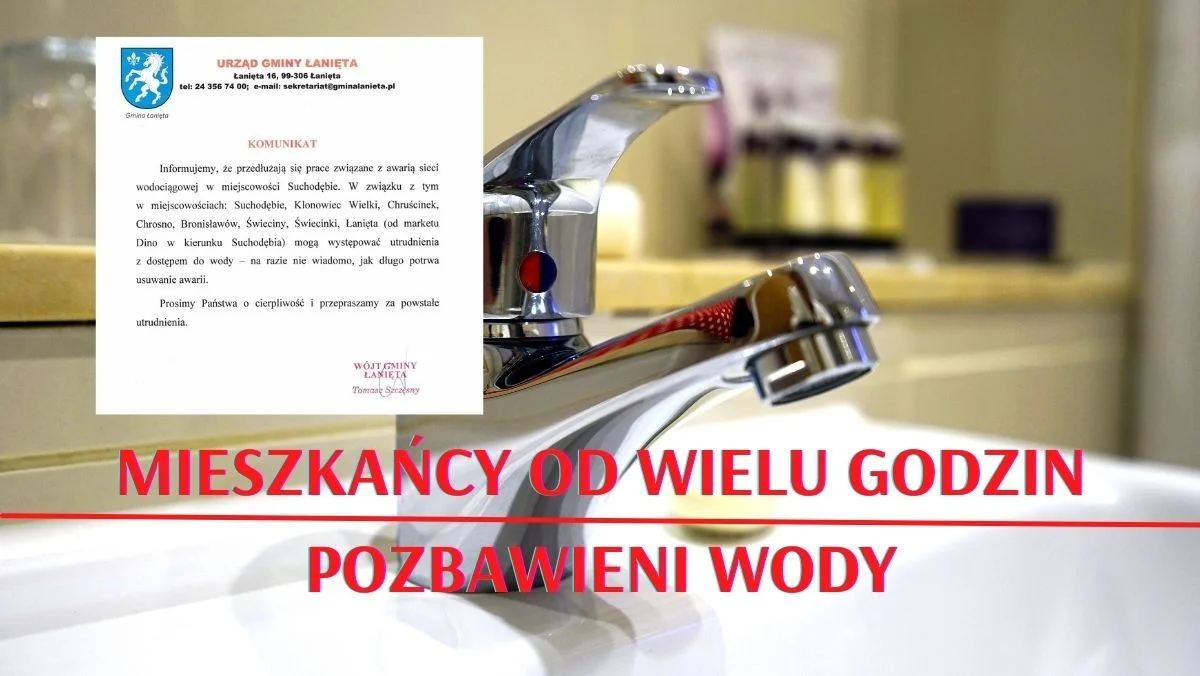 Pierwszy komunikat w tej sprawie pojawił się wczoraj po godzinie 13. Władze Gminy Łanięta poinformowały wówczas, że od godziny 21 w związku z awarią sieci wodociągowej w miejscowości Suchodębie planowane były przerwy w dostawach wody w miejscowościach: Suchodębie, Klonowiec Wielki, Chruścinek, Chrosno, Bronisławów, Świeciny oraz Świecinki.